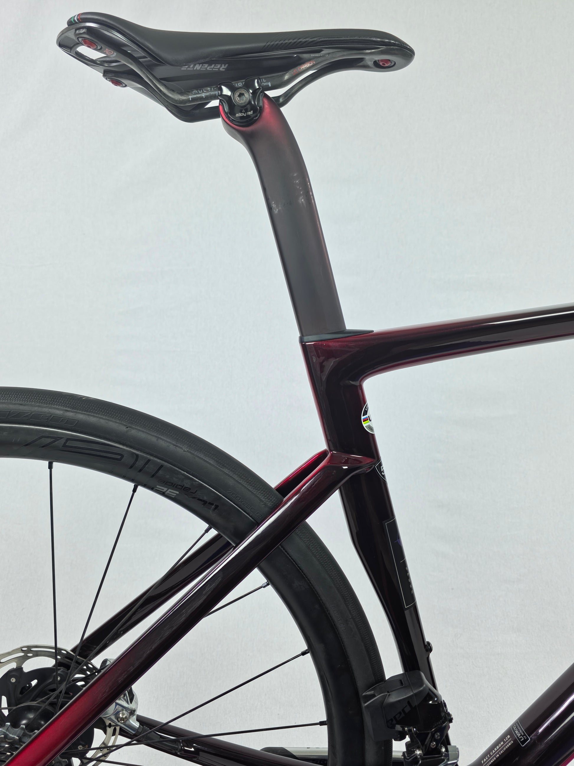 At the core is the FACT 12r carbon frame, optimized through extensive wind tunnel development to achieve aerodynamic efficiency without sacrificing stiffness or ride quality. The result is a race bike that climbs like a featherweight while cutting through flats with aero efficiency traditionally reserved for dedicated aero platforms.